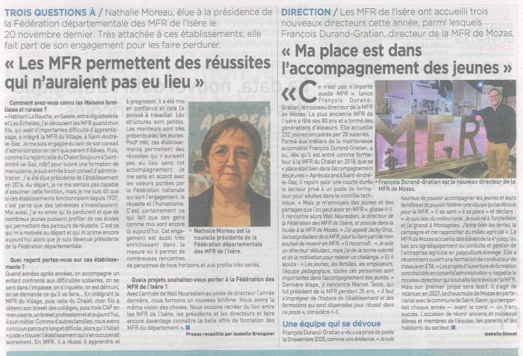 Ces deux parutions confirment l’attention portée aux MFR dans les médias locaux, soulignant leur rôle éducatif et social en Isère. Elles témoignent du travail quotidien des équipes, qu’il s’agisse de piloter la fédération départementale ou d’animer une MFR au plus près des jeunes et de leurs parcours.